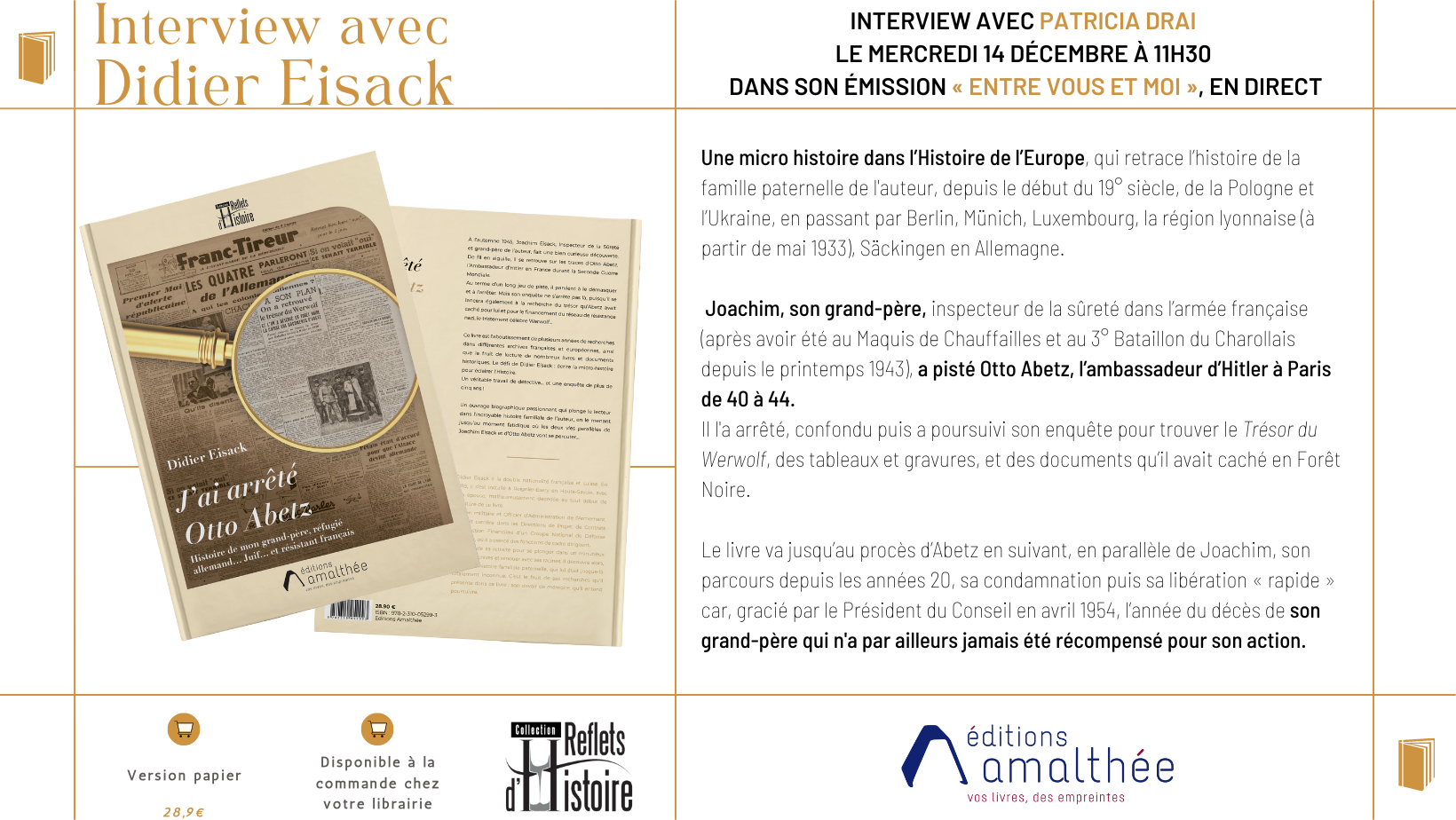 Didier Eisack – Interview avec Patricia Drai le mercredi 14 décembre à 11h30 dans son émission « Entre vous et moi », en direct.