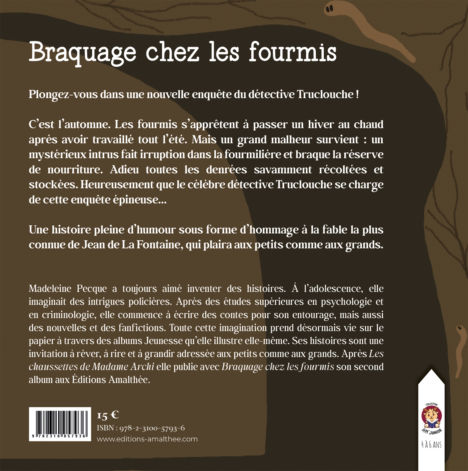 C’est l’automne. Les fourmis s’apprêtent à passer un hiver au chaud après avoir travaillé tout l’été. Mais un grand malheur survient : un mystérieux intrus fait irruption dans la fourmilière et braque la réserve de nourriture. Adieu toutes les denrées savamment récoltées et stockées. Heureusement que le célèbre détective Truclouche se charge de cette enquête épineuse…