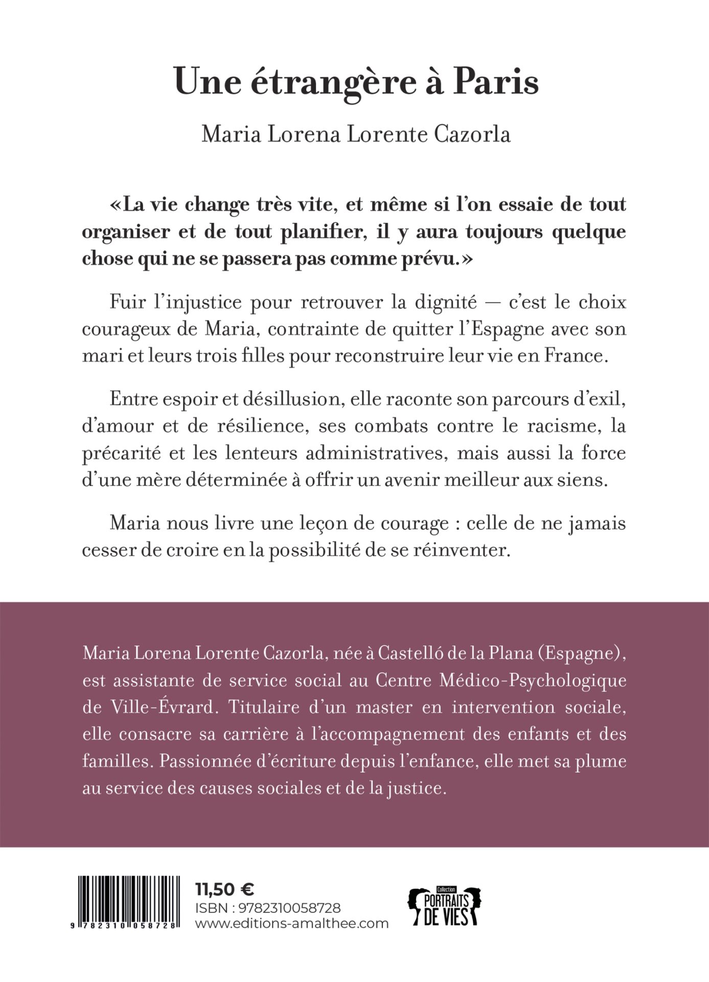 Fuir l’injustice pour retrouver la dignité — c’est le choix courageux de Maria, contrainte de quitter l’Espagne avec son mari et leurs trois filles pour reconstruire leur vie en France. Entre espoir et désillusion, elle raconte son parcours d’exil, d’amour et de résilience, ses combats contre le racisme, la précarité et les lenteurs administratives, mais aussi la force d’une mère déterminée à offrir un avenir meilleur aux siens.